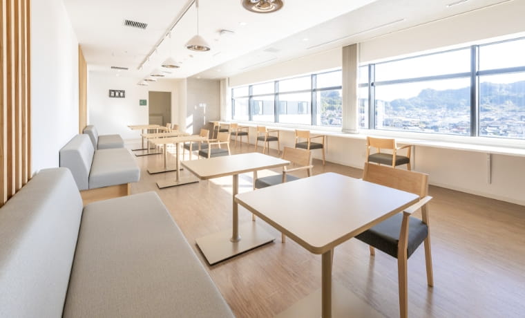 病棟各階には、患者さまやご家族が自由に利用できるデイルームを配置。3階にはベッドに寝たまま外に出られる屋外テラスも。自室とは異なる環境で過ごすことで、孤独感の軽減や気分転換につながります。