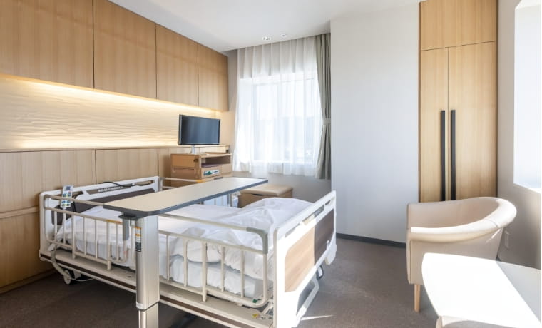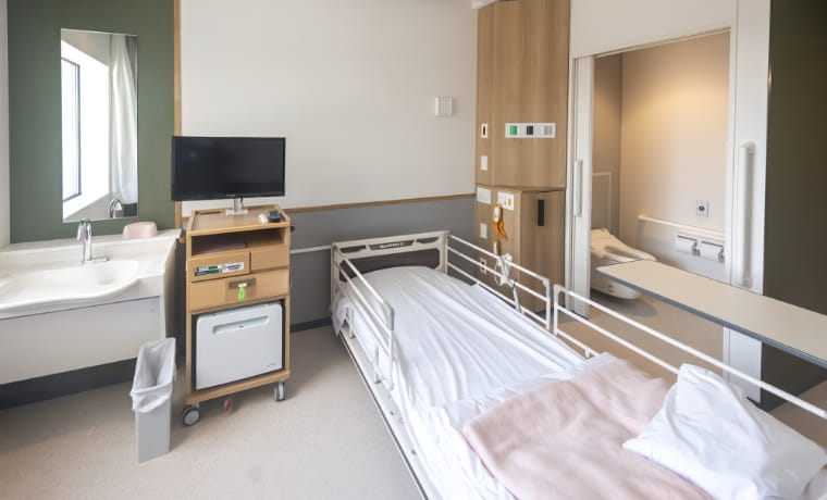 入院生活をより安心・快適に過ごせるよう、病室はすべて個室となっています。全室にトイレ、洗面台を完備し、テレビと冷蔵庫も有料で利用できます。