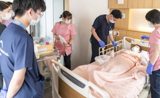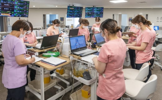 救急外来からの重症症例、手術後、病棟入院中の状態悪化などの患者さんの全身を管理するため、多様な医療機器やモニターが整備され、一般病棟より多くの看護師が配置されて濃密な看護を提供しています。