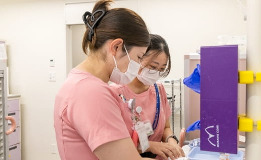 外来通院で化学療法を受けている患者の看護を行っています。住み慣れた環境で生活を送りながら、治療が受けられるよう安全・安楽な投与管理に努めています。患者・家族の苦痛緩和となるよう心がけ、継続したケアの提供を行っています。