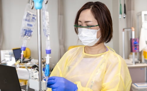 看護師が針を穿刺し、投与開始 -