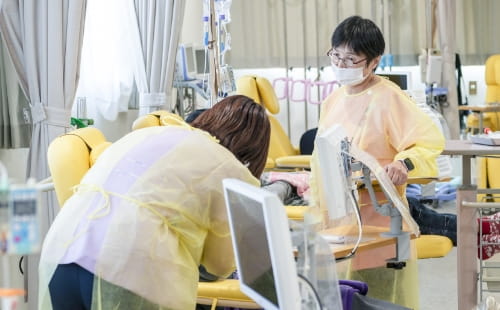 化学療法施行後は、副作用症状が出現するため、スタッフによる副作用の確認を随時行っております。