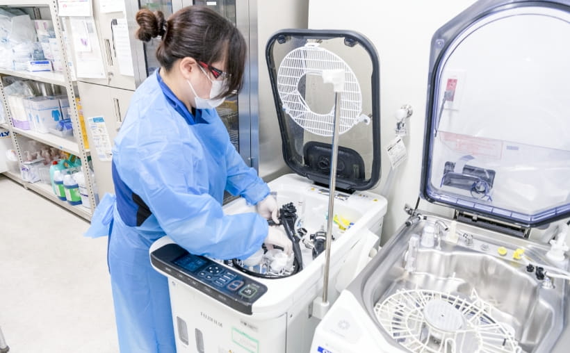 内視鏡スコープは、専用の洗浄室にて学会推奨レベルの洗浄・消毒を実施しています。